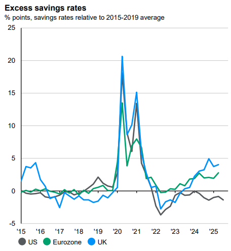Here in the UK, data was particularly weak, largely due to the uncertainty surrounding the Budget. However, in a number of cases, this weakness can be attributed to a temporary deterioration associated with Budget uncertainty and should improve going forward now that this uncertainty has been removed. Labour market weakness appears deeper rooted, with unemployment hitting the highest level since 2021. The silver lining is that with a well-entrenched disinflationary trend, the Bank of England (BoE) should be able to continue supporting the economy with interest rate cuts. The savings rate is still elevated relative to Europe, and especially the US, and as the return on cash depletes, there will be a greater propensity to consume, which will be very supportive for the UK economy.