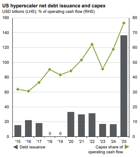 Similar to last quarter, equity market volatility remains well below average, and bond market volatility is sitting at 2021 lows. However, volatility did spike at times over the quarter as equity markets corrected. The corrections came from fears of history repeating itself in the form of the Great Financial Crisis in 2008 or the Dot Com Bubble in 2000. For the former, the bankruptcy of two US regional banks sparked concerns of financial contagion, and in the case of the latter, the elevated valuations of AI stocks and the initiation of financing capital expenditure with debt instead of solely cash flow provided the red flags. As the majority of free cash flow from AI stocks or hyperscalers is now being directed to AI capex, they will increasingly have to turn to debt markets if they want to direct incremental dollars to AI capex.