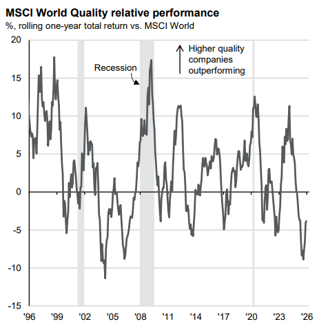Turning to portfolio activity, we exited our yen position as we lost conviction in the prospect for the yen to mean-revert to its historical average, given heightened debt concerns after the stimulus package announced by the recently appointed prime minister of Japan. We also saw better prospects elsewhere. Notably, high-quality stocks, which have been very much out of favour, registered their second-worst year of relative performance on record in 2025. This is starting to reverse, and we expect quality stocks to continue to outperform over the long run, as has historically occurred.